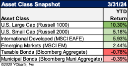 It was another rewarding quarter for equity investors who experienced a continuation of many of the same trends from 2023. The S&P 500 posted a total return of 10.56%, marking the best start to the year since 2019. Small cap stocks had a strong start to the year as well, as the Russell 2000 managed to rally more than 5%. Stocks in the energy, communications, financials, and industrial sectors were amongst the top performers, while real estate, consumer discretionary and utilities stocks rounded out the bottom. International developed stocks were firmly in positive territory as well, with the MSCI EAFE index higher by nearly 6% in total return. Emerging market stocks struggled to keep pace with their developed market counterparts, adding about 2.5% in total return for the quarter.